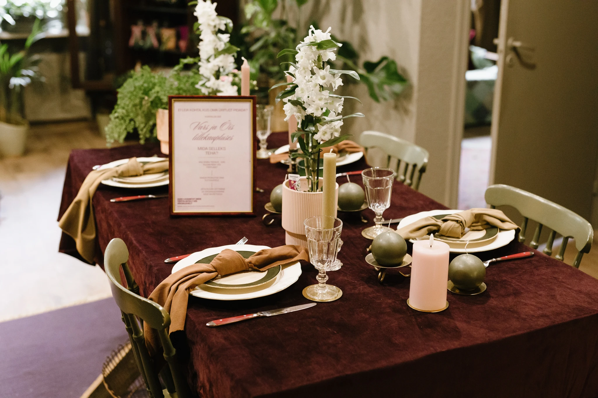 | Sisaldab | Ruumi valmis seadmine (laud, toolid, laudlinad, söögiriistad, taldrikud, tassid, pokaalid, serveerimisalused) ja ruumi koristus. | |